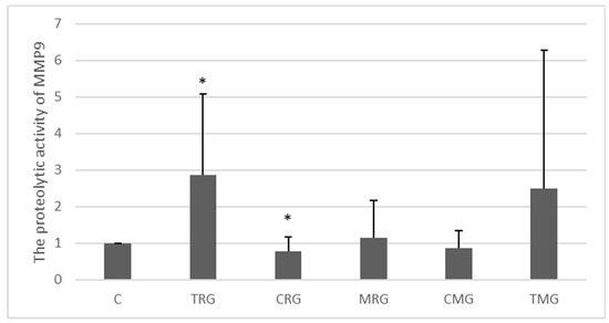 The activity of MMP-9 in the examined tissues was generally low (Figure 4). However, in the TRG group, a 187% increase in the activity of MMP-9 was observed compared to the C group (p < 0.05). A significant difference was also observed in the CRG group, where the expression of MMP-9 was decreased by 22% compared to control (Figure 4).