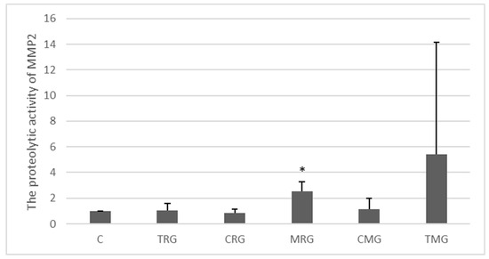 The zymographic analysis showed that the level of MMP-2 activity in the tissues studied was generally low (Figure 5). The only significant change was observed in the MRG group vs. C group, where the activity of the MMP under study was 153% higher (p < 0.05). The highest average level of activity was observed in the TMG group, but the difference was not significant.