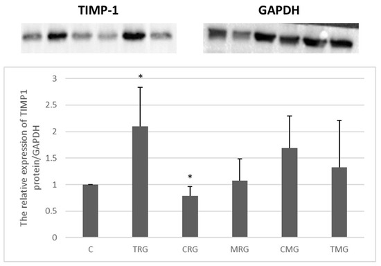 Each group, except the CRG group, was characterized by increased TIMP-1 protein expression compared to the control, but the change was significant only in the TRG group. In this group, the protein expression of TIMP-1 was more than 2-fold higher than in the control group (C) (p < 0.05). The lowest expression was observed in the CRG group, where the level of TIMP-1 protein was 21% lower than in the C group (p < 0.05) (Figure 7).