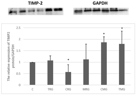 The CRG group was characterized by a 43% decrease in the expression of the TIMP-2 protein compared to the control (C) group (p < 0.05) (Figure 8). An increase in the expression was observed in the other groups, but it was significant only in the CMG and TMG groups (vs. C). The level of TIMP-2 expression was 87% higher in the CMG group and 80% higher in the TMG group (p < 0.05) (Figure 8).