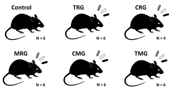 Groups of Wistar rats used in the experiment. Control—control group without any medication; TRG—rats treated with rapamycin, tacrolimus, and glucocorticosteroids; CRG—rats treated with rapamycin, cyclosporin A, and glucocorticosteroids; MRG—rats treated with rapamycin, mycophenolate mofetil, and glucocorticosteroids; CMG—rats treated with cyclosporin A, mycophenolate mofetil, and glucocorticosteroids; TMG—rats treated with tacrolimus, mycophenolate mofetil, and glucocorticosteroids.