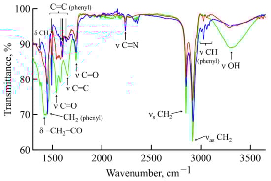 The buttons of the electrical switches studied in this work were made from ABS plastic, which is a graft copolymer of styrene with acrylonitrile and butadiene. This material is extensively used for the manufacture of various medical products, including electrical products in medical units. To monitor the chemical composition of the buttons used in this work, the IR spectra were obtained and analyzed from an ABS plastic switch button washed in an ultrasonic bath, a button with a freshly applied copper coating and a copper-coated button exposed in an intensive care unit for 22 weeks. The spectrum of the ABS plastic shown in Figure 1 (blue line) corresponds in composition to a copolymer of styrene with acrylonitrile and butadiene. This is indicated by the characteristic bands of the stretching vibrations of the C=C and C–H groups of the phenyl radical, the symmetric and asymmetric stretching vibrations of the CH2 groups, the stretching vibrations of the C≡N group and the skeletal vibrations of the aromatic ring [34]. In addition, this spectrum clearly shows the bands of the OH and C=O stretching vibrations, which arise during the thermal oxidation that accompanies the conventional processing of molded electrical products [35,36,37].