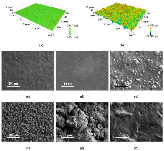 Confocal microscope images (a,b) and SEM images of the surface of uncoated (a,c–e) and copper-coated (b,f–h) electric switch buttons. SEM images were taken at different magnifications: ×500 (c,f), ×10,000 (d,g) and ×100,000 (e,h).