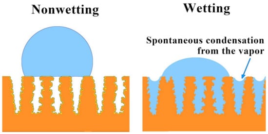 It has been shown previously that the antibacterial properties of metal surfaces, such as copper, significantly depend on the wetting of these surfaces with aqueous media [17,22,41]. Several factors affect this dependence. Firstly, the spread of bacterial infections in healthcare settings occurs through touch surfaces in the form of aerosols or microdroplets of biological fluids, such as sweat, saliva, urine, etc. [42,43]. All of these fluids contaminated with microorganisms are water-based suspensions. When drops of such suspensions come into contact with a solid surface, the nature of the interaction between, say, the bacterial cells and the surface and the morphology of the biofilms subsequently formed on the surface will largely depend on the wettability of this surface by the bacterial suspension [17,22,44]. Additionally, the intensity of the release of metal ions, which have a toxic effect on bacterial cells, depends on the corrosion processes at the interface between the metal substrate and the bacterial suspension [18]. The intensity of these processes, in turn, is determined by the area of interfacial contact, that is, by the contact angle of the suspension on the substrate [17]. Finally, a good wettability of porous substrates leads to capillary condensation of water vapor from the atmosphere into the pores of the substrate (Figure 4), ultimately resulting in long-term moisture retention on the surface with precipitated bacterial cells. The maintenance of moisture on the porous surface or the slow evaporation of an aqueous dispersion medium promotes cell viability and subsequent biofilm formation [45].