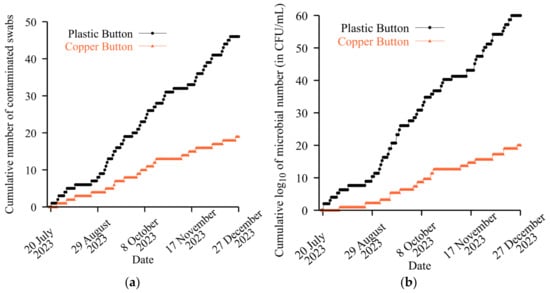 The results on the contamination of both buttons obtained as a result of this approach are presented in Figure 5a, where the abscissa axis shows the date of swab collection and the ordinate axis shows the cumulative total number of swabs in which microorganisms were found. To take into account the level of contamination using such a binary approach, the swab analysis result can be assigned not a value of 1 when microorganisms are detected but a value equal to the decimal logarithm of the total microbial number (Figure 5b). In this case, the ordinate axis shows the (cumulative) sum of the logarithms of the total microbial numbers at a specific moment of observation.