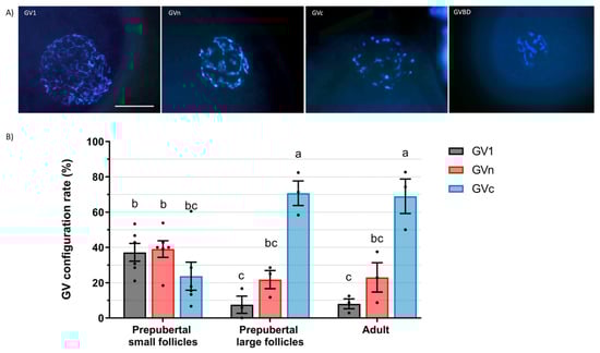 Germinal vesicle (GV) chromatin configuration of caprine oocytes. (A) GV configuration and GV breakdown (GVBD) representative images of Hoechst-stained oocytes. Scale bar: 30 µm. (B) GV configuration rate (mean ± S.E.M) according to the chromatin configurations from prepubertal small (<3 mm) or large (≥3 m) follicles or from adult follicles (≥3 m). Values with different letters differ significantly (p < 0.05). A total of 138, 43, and 66 oocytes for prepubertal small, prepubertal large, and adult follicles were assessed, respectively. Three replicates were carried out.