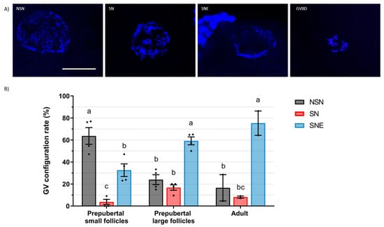 Germinal vesicle (GV) chromatin configuration of ovine oocytes. (A) GV configuration and GV breakdown (GVBD) representative images of Hoechst-stained oocytes. Scale bar: 30 µm. (B) GV configuration rate (mean ± S.E.M) according to the chromatin configurations from prepubertal small (<3 mm) or large (≥3 m) follicles or from adult follicles (≥3 m). Values with different letters differ significantly (p < 0.05). A total of 62, 78, and 36 oocytes for prepubertal small, prepubertal large, and adult follicles were assessed, respectively. Four replicates were carried out for prepubertal groups and two replicates for the adult group.