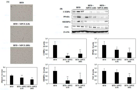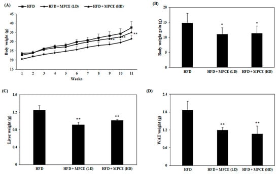 2.2. Effects of MPCE on HFD-Induced Adiposity in Obese Mice