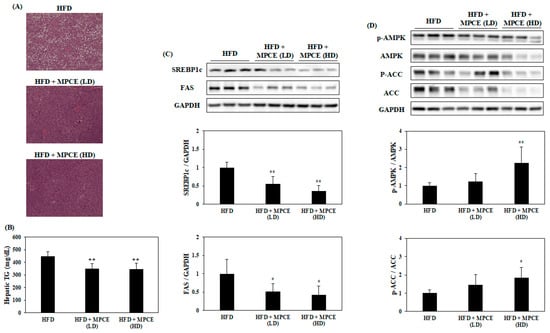 2.4. Effects of MPCE on Hepatic Lipid Accumulation and the Expression Levels of Lipid Metabolism-Related Proteins in HFD-Induced Obese Mice