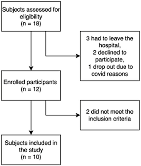 Eighteen subjects with SCI were selected for the study, but three had to be discharged from the hospital, two declined to participate, and one left the hospital because of positive COVID-19. Only twelve subjects agreed to participate, and two did not fulfill the inclusion criteria (one could not achieve a 6MWT, and the other had severe spasticity) (Figure 1). After providing written informed consent, ten subjects with SCI participated in the study. The mean age was 43.2 ± 11.5 years (range 26–61 years), with nine males and one female (Table 1).