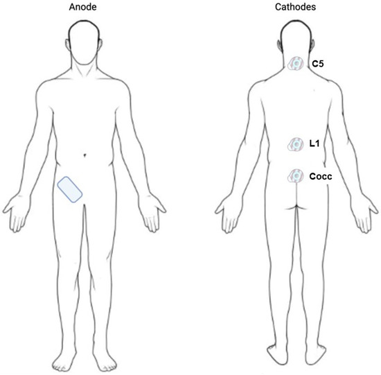 First, channel stimulation was delivered by a cathode at the C5 level; second, channel stimulation by a cathode at the L1 level; and third, channel stimulation by a cathode at the Coc1 level (Figure 2). One anode was placed at the right iliac crest (Figure 2). The appropriate stimulation intensity was identified for each subject as the highest intensity tolerated at each stimulation site (Table 1), and it was applied one day before the experimental conditions.
