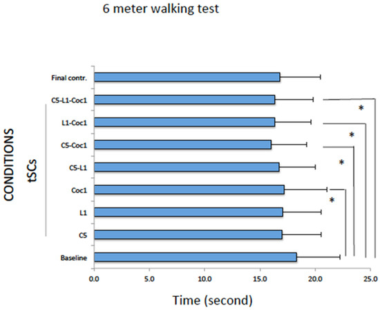 Six-meter walking test at baseline, during tSCS at different segments, and final control condition. The data were expressed as mean and standard error. * p ≤ 0.05 with respect to the baseline condition.