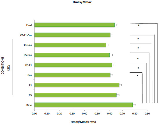 Despite the significant reduction in Hmax when tSCS was applied at Coc1, C5-L2, C5-Coc1, at multisegment tSCS, and under the final conditions (p < 0.05), there were no changes in Mmax (p > 0.05), except for tSCS at L1-Coc1, which increased significantly Mmax (p = 0.015) (Table 5A). Although Hmax/Mmax did not change when tSCS was applied at C5 (p = 0.09) or at L1 (p = 0.16), it decreased significantly when tSCS was applied at Coc1 (p = 0.018), C5-L1 (p = 0.043), C5-Coc1 (p = 0.008), L1-Coc1 (p = 0.014), or multisegmental tSCS (C5-L1-Coc1) (p = 0.014) with respect to the baseline conditions (Table 5B, Figure 5). The reduction in the Hmax/Mmax ratio was also significant during the final condition (p = 0.028).