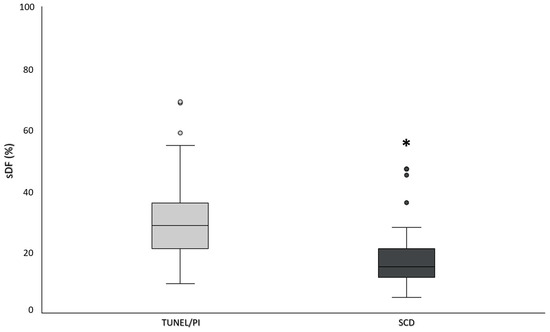 Figure 1. Box plots representing the percentage of sDF evaluated by TUNEL/PI method and SCD test in total sperm population (N = 71). *: significance, p < 0.001 vs. total sDF (TUNEL/PI). Dots represent outlier values.