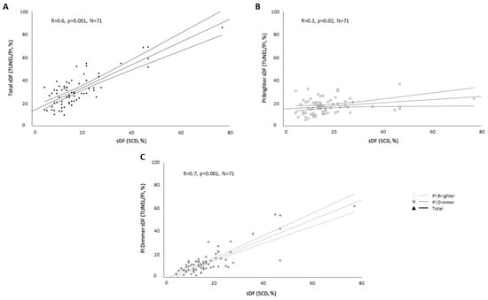 Figure 2. Correlations between the percentage of DNA-fragmented spermatozoa evaluated by SCD test and total (A), PI Brighter (B) and PI Dimmer (C) sDF evaluated by TUNEL/PI method. R: Spearman’s correlation coefficient; p: significance; N: number of subjects.