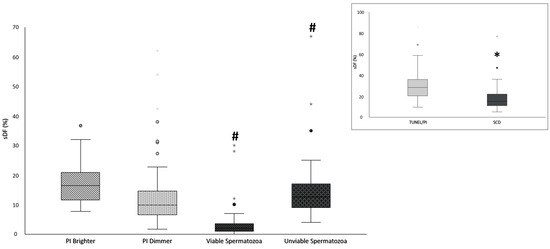 Figure 3. Box plots representing sDF in PI Brighter and PI Dimmer populations (evaluated by TUNEL/PI method) as well as in viable and unviable populations (evaluated by HOS/SCD test). In the insert, box plots representing sDF were evaluated by TUNEL/PI method and SCD test for total sperm population (N = 52). *: significance, p < 0.001 vs. Total sDF; # p < 0.01 vs. PI Brighter sDF. Dots represent outlier values.
