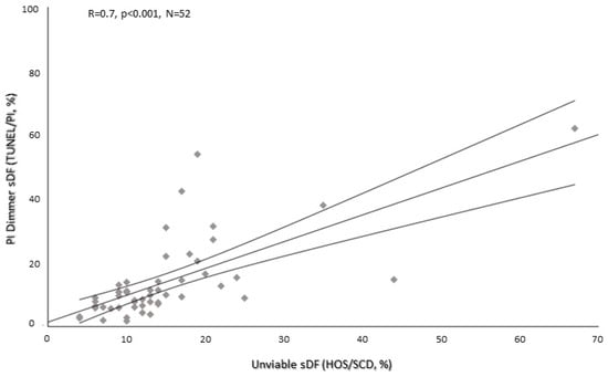 PI Dimmer and unviable HOS/SCD sDF values were correlated (r = 0.7, p < 0.001, N = 52, Figure 4). Moreover, the percentage of unviable cells with fragmented DNA was significantly lower with respect to PI Brighter sDF (median values [IQR]: 12.5% [9.0–17.0] for unviable HOS/SCD vs. 16.4% [11.5–21.0] for PI Brighter, p < 0.01, N = 52, Figure 3).