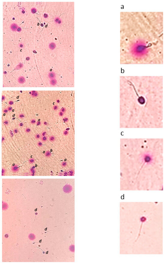 SCD was performed by SpermFunc®DNAf kit (BRED Life Science, Shenzhen, China). Briefly, semen samples were diluted in HTF medium at a concentration of 3 × 106/mL, and 60 µL were dispensed into the tube of dissolved agarose gel. Subsequently, 30 µL of sperm suspension was placed on the well of a pre-coated slide and leaving it at 2–8 °C for 5 min. The pre-coated slide was first incubated with the acid solution provided by the kit (solution A) at room temperature for 7 min and then in lysis solution (solution B) for 25 min at room temperature. After washing in distilled water for 5 min, the pre-coated slide was moved to 70% ethanol for two minutes, then to 90% ethanol for two minutes, and finally to 100% ethanol for two minutes. Staining was performed by dispensing 15–20 drops of Wright’s stain on the pre-coated slide and incubating for 15 min and then washing with water. Once the slide was air dried, a total of 200 spermatozoa were evaluated on each slide, with a 40× bright-field microscope (Nikon Eclipse Ci, Nikon Europe B.V., Amstelveen, The Netherlands). The score was performed according to the instructions provided by the manufacturer: spermatozoa with large or medium-sized halos were identified as non-fragmented cells (SCD+), whereas cells with small or no halos were identified as fragmented cells (SCD−) [43]. The percentage of DNA-fragmented spermatozoa was calculated dividing the number of SCD-spermatozoa on the total number of spermatozoa observed ×100.