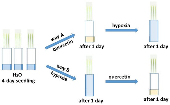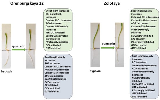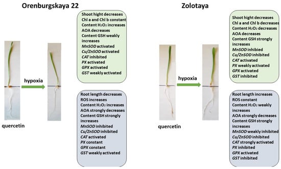 The deficiency of O2 has the greatest negative effect on seed germination and in the early stages of plant development [,]. The effect of hypoxia was studied on six-day-old wheat seedlings grown in a roll culture. To study the reduction of excess ROS formed during hypoxia, the treatment of seedlings of two varieties of Orenburgskaya 22 (Triticum aestivum) and Zolotaya (Triticum durum) with Qu was used before and after hypoxia for antioxidant systems, according to the scheme below (Figure 1).
