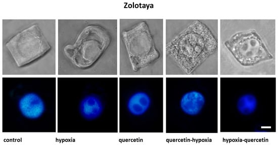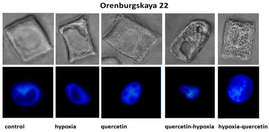 Pre-treatment with Qu before exposure to hypoxia on seedlings of the Orenburgskaya 22 variety is accompanied by the formation of giant vacuoles, which can lead to kernel deformation. However, there are cells with a granular structure. In the Zolotaya variety, interphase (G2) and prophase cells are characterized by the granularity of the cytoplasm at the G2 and prophase stages.