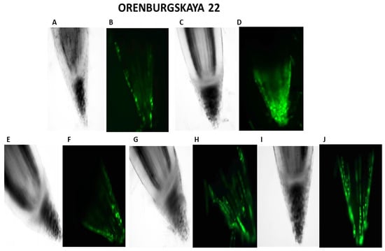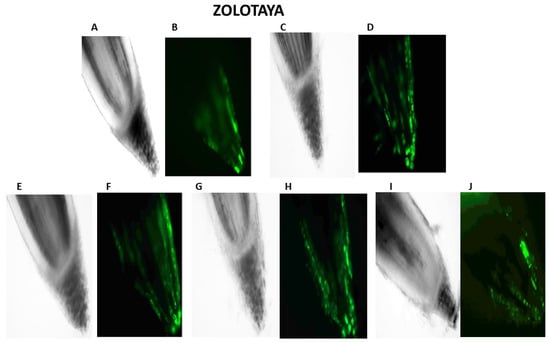Distribution of ROS+ and ROS—cells in the zones of six-day seedling of wheat roots Orenburgskaya 22 and Zolotaya: A, B—control; C, D—hypoxia: E, F—Qu; G, H—Qu+hypoxia; and I, J—hypoxia+Qu. Bar 400 µm.