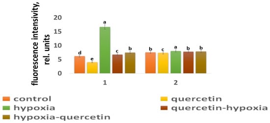 The intensity of ROS fluorescence under the influence of stress factors in wheat: 1—variety Orenburgskaya 22; and 2—variety Zolotaya. a–e-indicate significant difference were determined (p < 0.05).