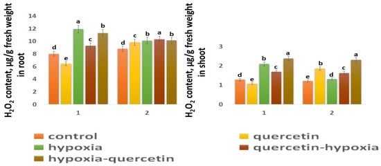 H2O2 content in roots and shoots in six-day seedlings of Orenburgskaya 22 variety (1) and Zolotaya variety (2). a–e-indicate significant difference were determined (p < 0.05).