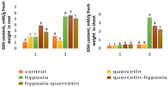 Qu has a positive effect on the Orenburgskaya 22 variety, especially on the roots: the GSH content increases by 1.77 times. At the same time, in the roots of the Zolotaya variety, Qu inhibits the synthesis of GSH: its content decreases by 1.58 times. Qu has little effect on the GSH content in the shoots of both wheat varieties. Treatment with Qu both before and after hypoxia, in the variety Orenburgskaya 22, increases the GSH content, especially in the roots (before by 1.98 times; after by 1.44 times). If treatment of the roots of the Zolotaya variety with Qu is not as effective as for the Orenburgskaya 22 variety, then this treatment has a negative effect on the shoots: the GSH content decreases (before 1.36 times; after −1.6 times).