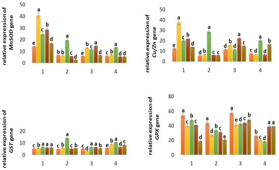 Expression of MnSOD, Cu/ZnSOD, GST, GPX, CAT, and PX genes in six-day seedlings of wheat varieties Orenburgskaya 22 (1, 3) and Zolotaya (2, 4) under the influence of various factors in (1,2)—roots, (3,4)—shoots. a–e-indicate significant difference were determined (p < 0.05).
