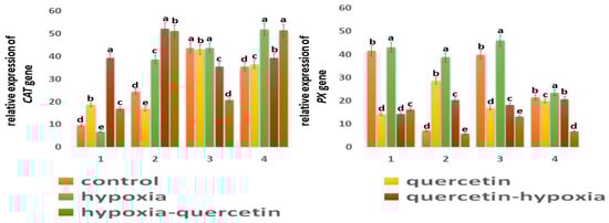 One of the main enzymes involved in the conversion of H2O2 to H2O and O2 is catalase (CAT) [,]. Based on the data obtained, it follows that CAT is more active in shoots than in roots in both wheat genotypes: in Orenburgskaya 22 by 4.55 times; in Zolotoy by 1.45 times. It is interesting to note that CAT is most active in the roots of the Zolotaya variety and in the shoots of the Orenburgskaya 22 variety. Hypoxia leads to an increase in activity in the Zolotaya variety in both roots and shoots (1.59 times, and 1.47 times, respectively). If O2 deficiency is not accompanied by changes in the expression of CAT in the shoots of the Orenburgskaya 22 variety, a significant drop in CAT activity by 1.43 times is observed in the roots. Qu causes the activation of the CAT expression in the roots of Orenburgskaya 22 (1.96 times), and, in the Zolotaya variety, the inhibition of CAT activity is observed. In the shoots of both wheat varieties, Qu did not have a significant effect on CAT levels. Pretreatment with Qu leads to a sharp increase in the level of CAT expression in the roots of both wheat varieties, especially in the roots of the Orenburgskaya 22 variety (4.09 times). In shoots of the Zolotaya variety, there is also an increase in CAT activity before and after treatment with Qu, and, in shoots of the Orenburgskaya 22 variety, under the same conditions, CAT activity decreases.
