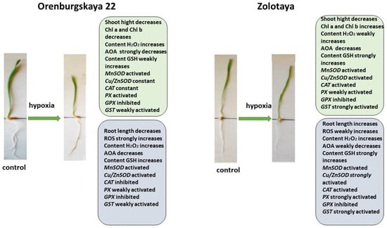 Under stressful circumstances, when ROS accumulate in plants and the enzymatic AOS is unable to neutralize excess ROS, low-molecular-weight antioxidants are activated in plants. One of the most important antioxidants is GSH []. The main place of its localization is chloroplasts. GSH is often used as a marker of plant resistance to stressors []. In the roots, the GSH content of the Zolotaya variety is almost two times higher than that of the Orenburgskaya 22 variety. As a result of a decrease in O2 levels, an increase in GSH content is observed in all wheat genotypes, both in shoots and roots. But if the increase in GSH in the Orenburgskaya 22 variety is not so significant, then, in the roots of the Zolotaya variety, the GSH increase occurs more than seven times. Such a high GSH content in the Zolotaya variety may be due to the fact that the functioning of chloroplasts plays a special role in the Zolotaya variety under O2 deficiency. This assumption is also confirmed by the special activity of the chloroplast Cu/ZnSOD under hypoxic conditions. One of the evidence of the special role of GSH in the Zolotaya variety under hypoxia is the activation of GST-glutathione-S-transferase, an enzyme involved in detoxification together with GSH [,].