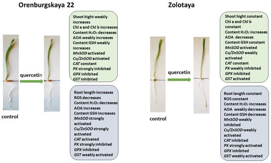The addition of exogenous Qu to the Orenburgskaya 22 variety had a beneficial effect on both morphometric parameters and Chls content (Figure 9). Moreover, a decrease in ROS and H2O2 levels was noted. The total AOA increased, and MnSOD and Cu/ZnSOD activities also increased, especially in roots. But, at the same time, the inhibition of the activity of enzymes involved in the neutralization of H2O2 was observed. One can guess that exogenous Qu activates SOD enzymes itself and actively participates in the neutralization of H2O2, inhibiting enzyme activity, participating in this process.