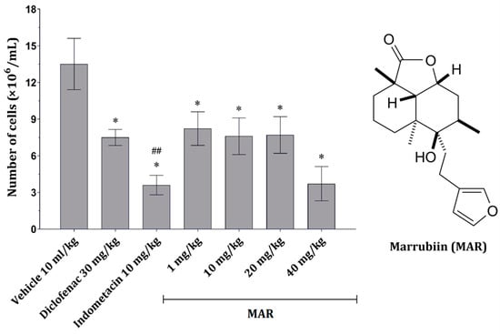 (Left) The number of peritoneal inflammatory cells obtained from mice belonging to different experimental groups; data given as mean ± SD (n = 6), compared using one-way ANOVA followed by Tukey’s post hoc test, * p < 0.001 vs. vehicle-treated animals; ## p < 0.01 vs. diclofenac-treated animals. (Right) Chemical structure of marrubiin (MAR).