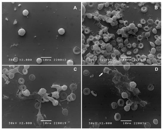 In the control group of animals, white blood cells (WBCs) were small, with a size equivalent to the size of the erythrocyte. Even though cell adhesion was noted, the microvilli of these cells were short, scarce, and unevenly distributed (Figure 2A). Carrageenan stimulation induced an inflammatory response (Figure 2B). Massive erythrocyte aggregation was caused by extravasation and endothelial damage. Fibrillar structures may represent neutrophil extracellular traps (NETs). Indometacin reduced the inflammatory response (Figure 2C) by decreasing erythrocyte aggregation and formation of inflammatory debris. MAR administration prior to carrageenan stimulation decreased the extent of inflammatory response and caused occasional apoptosis (Figure 2D; arrow).