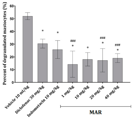 Compared with the control (carrageenan only), where a significant increase in degranulated mast cells was observed, a significant decrease in degranulation could be observed in animals treated with MAR in all four doses (Figure 3). Interestingly, the most pronounced effect was visible in animals treated with MAR at 1 mg/kg. The effects of diclofenac (30 mg/kg) and indometacin (10 mg/kg) were noticeable and uniform; however, their effect was significantly less pronounced than that of MAR (Figure 3).