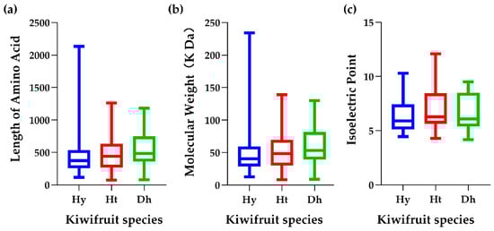 Physicochemical properties of LRR-RLPs in kiwifruit. (a) Length of amino acid in kiwifruit LRR-RLPs. (b) Molecular weight of kiwifruit LRR-RLPs. (c) Isoelectric point of kiwifruit LRR-RLPs. Different colors represent distinct kiwifruit species. Blue, red, and green represent ‘Hongyang’, ‘Huate’, and ‘Red5’ kiwifruit, respectively.