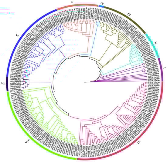 To understand the evolutionary relationship between ‘Hongyang’ and ‘Huate’ kiwifruit, we performed multiple sequence alignment using MAFFT v7.490 for 101 HyLRR-RLPs and 164 HtLRR-RLPs identified in this study. Subsequently, a phylogenetic tree was constructed using the maximum likelihood method with IQtree v2.0.3 for Linux 64-bit (Figure 2). Based on the clustering results of the phylogenetic tree, we divided it into 9 groups. The distributions of ‘Hongyang’ kiwifruit and ‘Huate’ kiwifruit within each group are listed in Table 1. Notably, group IX exhibited the highest count with 71 members, including 25 HyLRR-RLPs and 46 HtLRR-RLPs. Group VIII followed closely, with 57 members, consisting of 22 HyLRR-RLPs and 35 HtLRR-RLPs. Conversely, group IV housed the fewest LRR-RLPs members, with 1 HyLRR-RLPs and 2 HyLRR-RLPs. The phylogenetic tree in Figure 2 and Table 1 illustrates a discernible clustering pattern, indicating a trend of convergent evolution of the kiwifruit LRR-RLP gene.