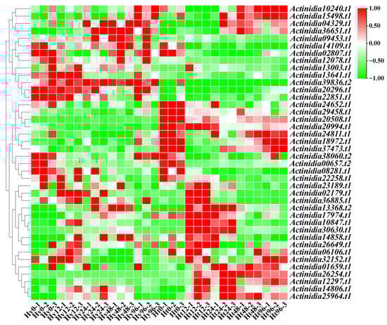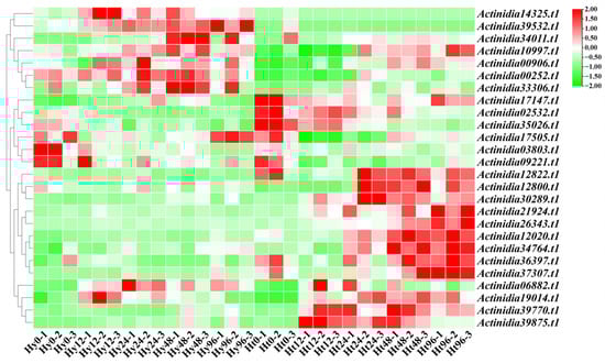 In Figure 5, several genes exhibit interesting expression changes. Actinidia39875.t1 was differentially expressed in both Hy and Ht, with a higher expression in Ht kiwifruit at each time point. In Hy, the expression of Actinidia39875.t1 gradually increased, while in Ht, it initially increased, peaked at 12 h, and then gradually decreased. Actinidia35026.t1 was not differently expressed in Hy, but was differently expressed at 48 h and 96 h in Ht. The expression of Actinidia35026.t1 remained stable in ‘Hongyang’ kiwifruit and gradually decreased in ‘Huate’ kiwifruit. Actinidia12020.t1 and Actinidia34764.t1 in Hy had relatively constant expression levels with no differential expression. However, their expression levels show a gradual increasing trend in Ht, and both were differentially up-regulated at the 48 h and 96 h time points. This suggests that these two genes in Ht consistently respond to Psa infection. According to these results, we speculate that the four genes Actinidia39875.t1, Actinidia35026.t1, Actinidia12020.t1, and Actinidia34764.t1 play a role in the process of Psa infection. Actinidia39875.t1, and Actinidia35026.t1 play a role in the early stage of Psa infection, while Actinidia12020.t1 and Actinidia34764.t1 play a role in the late stage of Psa infection.