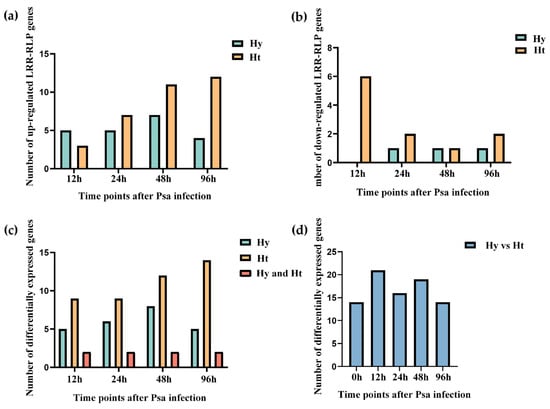 Based on the transcriptome data of kiwifruit infected with Psa, we analyzed the expressions of LRR-RLP genes (Figure 3). Our analysis revealed differentially expressed LRR-RLP genes in both resistant ‘Huate’ kiwifruit (Ht) and susceptible ‘Hongyang’ kiwifruit (Hy) during Psa infection. Specifically, 10 LRR-RLPs genes were differentially expressed in Hy, and 22 LRR-RLP genes were differentially expressed in Ht. We found that the number of LRR-RLPs in Ht was more than that in Hy, regardless of the differentially up-regulated expression or differentially down-regulated expression (Figure 4a,b).