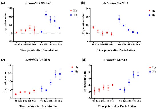 Expression levels of representative differentially expressed LRR-RLPs between susceptible (Hy) and resistant (Ht) kiwifruit after Psa infection. The X-axis represents the time point after Psa infection, and the Y-axis represents the gene expression value. (a) The expression value of Actinidia39875.t1. (b) The expression value of Actinidia35026.t1. (c) The expression value of Actinidia12020.t1. (d) The expression value of Actinidia34764.t1.