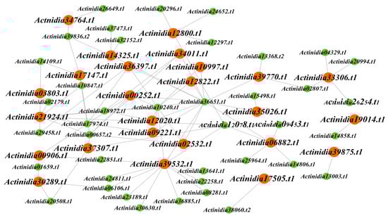 In order to intuitively observe the intricate relationship between the 40 transcription factors and the 25 genes, we plotted a network diagram, as illustrated in Figure 7. Utilizing the PlantRegMap database, we further obtained the families of these 40 transcription factors (Table S7). Among them, 15 transcription factors exclusively differentially expressed in Ht belong to the MYB, TCP, WRKY, TALE, HD-ZIP, ERF, bZIP, and C2H2 families. Specially, Actinidia29458.t1 serves as an upstream transcription factor for Actinidia36397.t1 and Actinidia21924.t1. Actinidia14109.t1 is an upstream transcription factor for Actinidia17147.t1 and Actinidia21924.t1. Both Actinidia29458.t1 and Actinidia14109.t1 belong to the ERF family, and this family is involved in regulating plant development and tolerance to biotic/abiotic stresses []. Actinidia10240.t1, a member of the TALE family, functions as an upstream transcription factor for Actinidia02532.t1, Actinidia00252.t1, Actinidia09221.t1, Actinidia10997.t1, Actinidia12822.t1, Actinidia36397.t1, Actinidia39532.t1, Actinidia21924.t1, and Actinidia12020.t1. The TALE family is associated with meristem formation and the regulation of leaf morphology []. Furthermore, Actinidia37473.t1 is an upstream transcription factor of Actinidia14325.t1. Actinidia39836.t2 is an upstream transcription factor for Actinidia14325.t1, Actinidia17147.t1, and Actinidia34764.t1. Actinidia37473.t1 and Actinidia39836.t2 belong to the C2H2 gene family, which is involved in plant development, and can control chloroplast development and starch granule formation []. These differentially expressed transcription factors have the potential to regulate the expression of kiwifruit LRR-RLP genes, thereby influencing plant resistance.