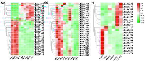 The expression profiles of differentially expressed LRR-RLP genes in kiwifruit waterlogging, heat, and copper stress. (a) Heatmap depicting differentially expressed kiwifruit LRR-RLPs under waterlogging stress. (b) Heatmap illustrating differentially expressed kiwifruit LRR-RLPs under heat stress. (c) Heatmap presenting differentially expressed kiwifruit LRR-RLPs under copper stress.