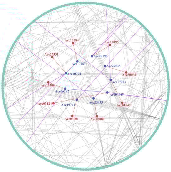 Protein interaction network involving kiwifruit LRR-RLPs. Red circles represent the LRR-RLP proteins, while blue circles represent other proteins associated with LRR-RLPs. The red lines connect the LRR-RLP proteins to other associated proteins, purple lines connect proteins associated with LRR-RLPs and other proteins associated with them, and blue lines link to other proteins associated with LRR-RLPs. The gray lines connect proteins encoded by genes that are differentially expressed, except for LRR-RLPs and other proteins associated with them.