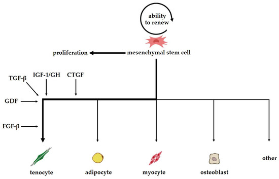 Many growth factors and proteins are involved in tendon regeneration and the differentiation of stem cells into tendon cells. Their influence on this complex process is still being investigated. In rats, polyglycolic acid (PGA) and type I collagen scaffolds were used and attached with a frame suture to ensure postoperative functional continuity. In the study group, the scaffolds were seeded with MSCs or tenocytes; the control group did not have cells. The samples using tenocytes had significantly better strength compared with MSCs and the control group, while the maximum strength to resist failure was similar in all groups [45]. These findings suggest that the presence of differentiated tenocytes has a direct impact on the quality of the regenerating tendon. Because the process is complex, there are many factors that trigger the differentiation of stem cells into other cell lines [45,46]. In the following subsections, we describe a few of them.