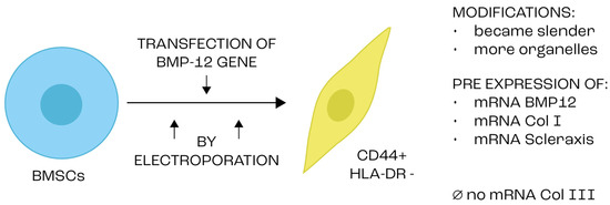 Genetic modification can also be used to stimulate tendon differentiation. Researchers implanted TSPCs into the damaged patellar tendon after infecting it with a recombinant adenovirus containing BMP12 and CTGF [136]. There was increased expression of Tnc, Scx and type I and III collagen. TSPCs with high expression of BMP12 and CTGF stimulated tendon repair in vivo. In another study, researchers transfected MSCs with the BMP12 gene by electroporation. The modified cells showed an altered morphology: they became more slender and formed a network. In addition, they expressed BMP12 and type I collagen messenger RNA (mRNA), but not type III collagen mRNA. The newly formed cells were positive for CD44 but negative for HLA-DR (Figure 2). This proves that through genetic engineering—in this case, transfecting BMSCs with BMP12—it is possible to stimulate their differentiation into tendon tissue cells [137].