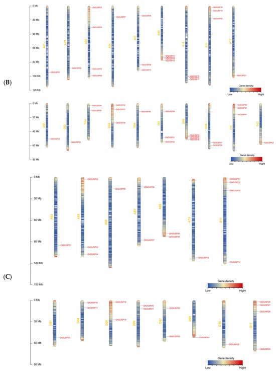 3.2. Basic Analysis of DUSP Families in Four Major Cotton Species