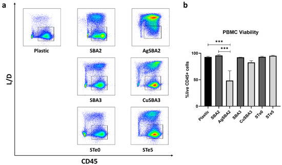 PBMCs from four healthy adult donors were cultured in RPMI 1640, supplemented with 10% (v/v) heat-inactivated FBS, 100 U/mL penicillin/streptomycin, and 100 μg/mL gentamicin (Life technologies, Carlsbad, CA, USA), at 37 °C and 5% CO2. A total of 1 × 106 fresh cells/mL were seeded onto sterile discs of bioactive glasses (or in wells without bioactive glasses—negative control) for 48 h, keeping the polished side upwards. Afterwards, the media was removed, and cells were collected and washed with PBS-EDTA 2 mM. The cells were stained with a viability dye (BD Horizon™ Fixable Viability Stain 780 (Becton and Dickinson, Franklin Lakes, NJ, USA)) for 15 min, at 4 °C, to distinguish live and dead cells. After washing with PBS-EDTA, Human BD™ Fc block solution was added to block the non-specific binding of immunoglobulin to Fc receptors. Subsequently, cells were incubated with antiCD45 BUV395 mAb (clone: HI30), a pan-marker for all leukocytes. Lastly, the cells were washed and resuspended in PBS-EDTA for acquisition using a BD FACSymphony™ A5 flow cytometer (BD Biosciences, Franklin Lakes, NJ, USA). The samples were then analyzed using the BD FACSDIVA™ software version 9.0.