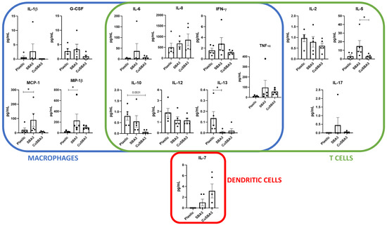 Considering the phenotypical variances observed during PBMC culture related exclusively to the copper-doped glass, in order to verify if the Th1/Th17 shift was paralleled by differential cytokine secretion, a further cytokine quantification ELISA was performed using a commercial multiplex kit. This comprised seventeen cytokines released from macrophage or T-cells exclusively, or by both cell populations (Figure 3). Among these, levels of GM-CSF and IL-4 were close to, or below the lower limit of quantification and thus, were not suitable for statistical comparison.