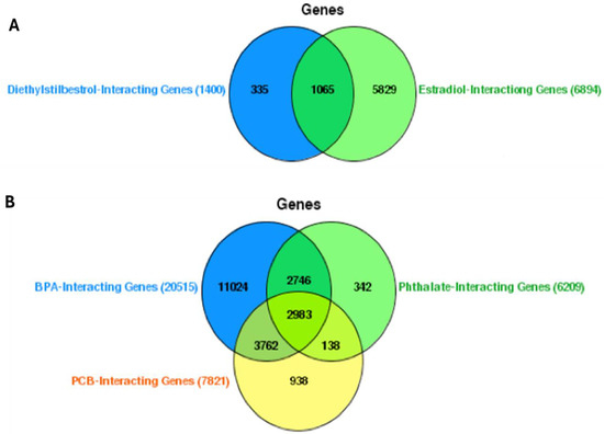 The thorough examination of genes that interact with EEDs has resulted in an intricate network of intersections, as seen in Figure 1. The Venn diagrams depict the intersecting gene interactions among four categories of EEDs: diethylstilbestrol, E2, BPA, and phthalates. Additionally, each of these groupings is compared to PCBs. The analysis reveals that diethylstilbestrol exhibits interactions with a total of 1400 genes. Among these, 335 genes are exclusively associated with DES, while 1065 genes overlap with those that also interact with E2. In total, E2 interacts with 6894 genes (Figure 2A) (Supplementary File S1). The presence of an overlap between DES and E2 suggests that they share a route or have comparable methods of action. This is supported by the fact that 5829 genes do not interact with DES. This indicates that E2 has a wider range of influence on the genetic landscape (Figure 2A). BPA, phthalates, and PCBs exhibit a complex network of gene interactions. BPA interacts with a total of 20,515 genes. Out of these, 11,024 genes are specifically affected by BPA, while 2746 genes are affected by both phthalates and PCBs. This indicates that there is a similarity in the way these substances impair gene expression. Phthalates interact with a total of 6209 genes, with 342 unique interactions. They also have a small portion of interactions in common with PCBs, which altogether interact with 7821 genes. The intersection of the three EEDs encompasses a total of 2983 genes, indicating a notable core of genes that may have regulatory significance in the context of vascular disorders (Figure 2B) (Supplementary File S2). The 938 genes that exclusively interact with PCBs exhibit a distinctive genetic profile that may be associated with the specific chemical composition and biological effects of PCBs. This particular subset of individuals may offer insights into the precise cardiovascular and vascular disorders linked to exposure to PCBs (Figure 2B) (Supplementary File S2).