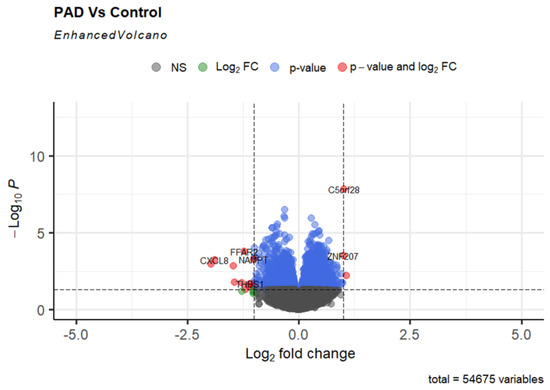 In our investigation of gene expression patterns associated with PAD, a common kind of systemic atherosclerosis that causes the narrowing of leg arteries over time, we used RNA sequencing data from the GSE27034 dataset to analyze gene expression patterns. Circulating monocytes, which establish and retain contact with the arterial wall, can serve as indications of vascular abnormalities in PAD conditions. In order to identify genes with modified expression patterns, we performed a differential gene expression analysis on peripheral blood mononuclear cells (PBMCs) obtained from patients with PAD and compared them to a control group of 18 individuals without PAD. Our research showed that many genes displayed significant changes in expression, with log fold changes (logFC) greater than 1 in magnitude, indicating either upregulation or downregulation in the context of PAD. Our differential expression analysis revealed a distinct set of genes significantly dysregulated in PAD (Supplementary File S4). Specifically, we observed upregulation in genes such as C5orf28 and ZNF207. In contrast, several genes, including FCGR3A, EGR3, FFAR2, CXCL8, PTGS2, and G0S2, were notably downregulated as shown in Figure 4 (Supplementary File S4). A volcano plot was constructed to effectively display these genes, highlighting the significant shifts in expression levels and the importance of their potential role in PAD pathophysiology.